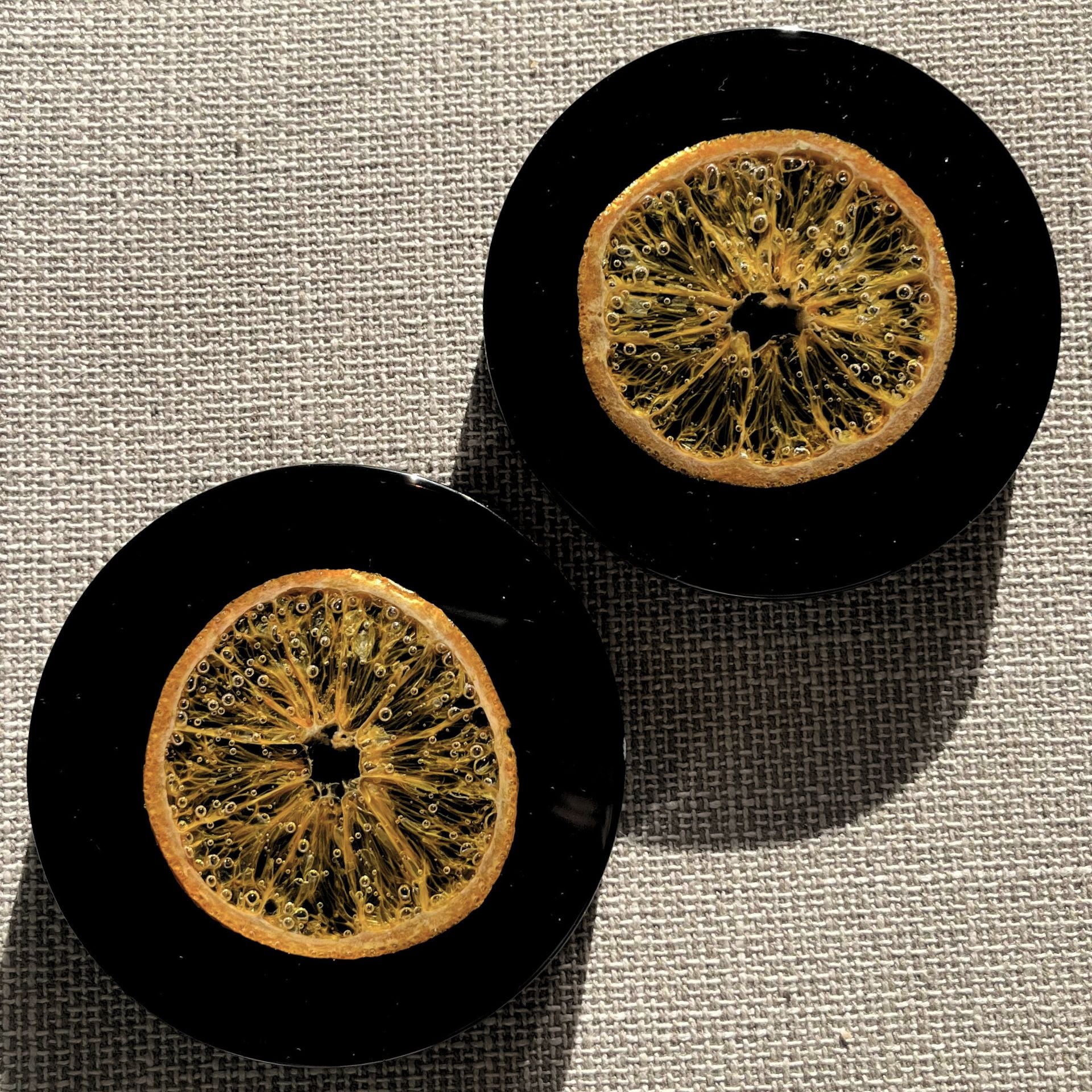 Jeder Untersetzer enthält eine echte, getrocknete Orangenscheibe 🍊 – eingebettet in glänzendes Harz.